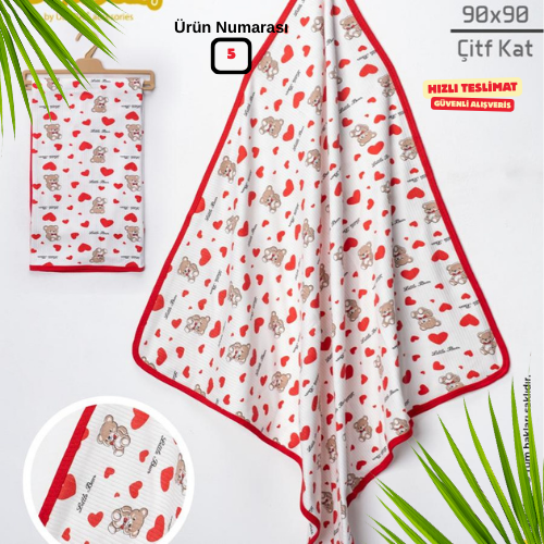 Bebeklerin hassas cildi düşünülerek tasarlanan 90x90 Çift Kat Müslin Bebek Battaniyesi, yumuşacık dokusu ve nefes alan yapısıyla dört mevsim kullanım için mükemmel bir seçimdir.