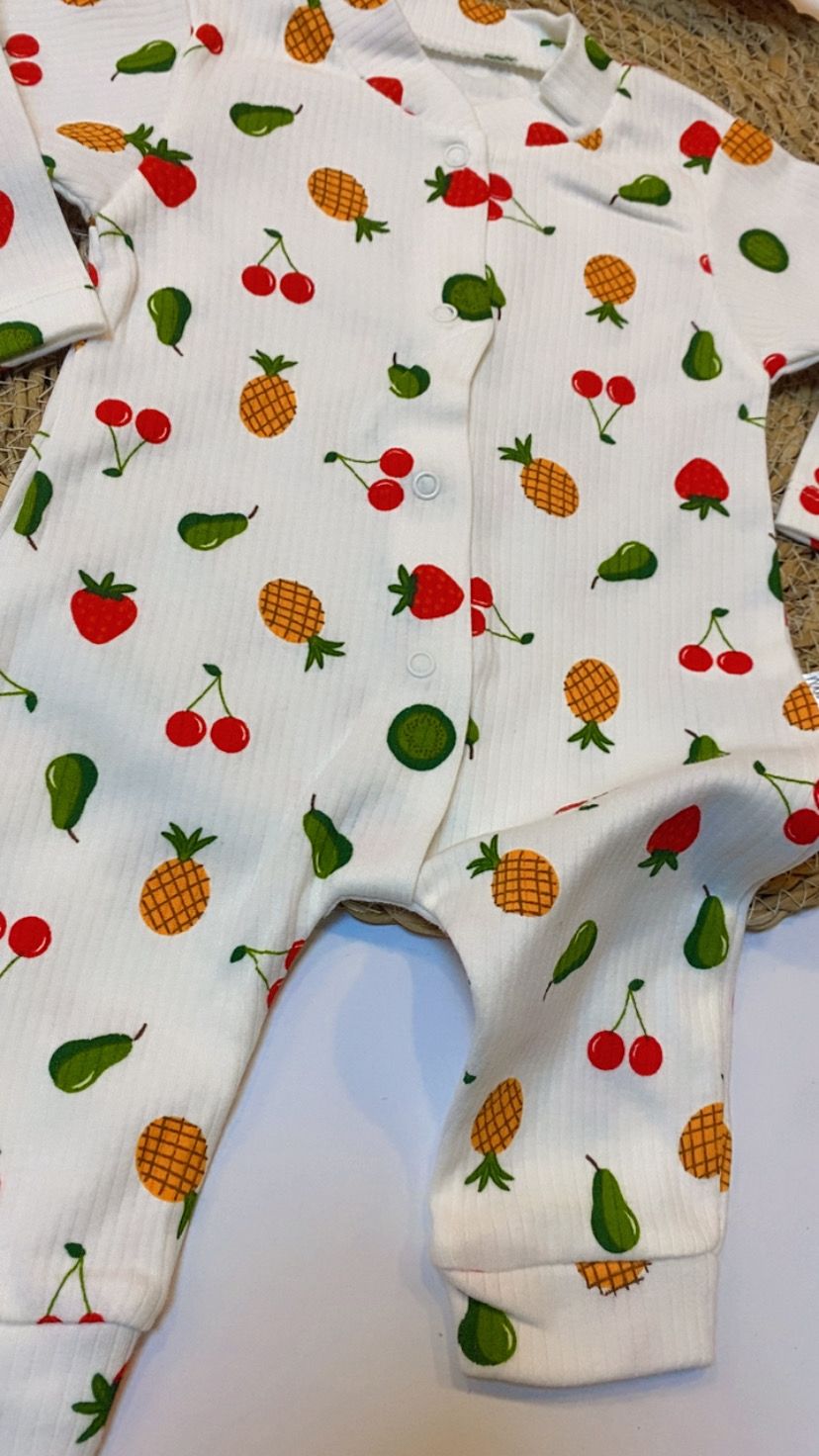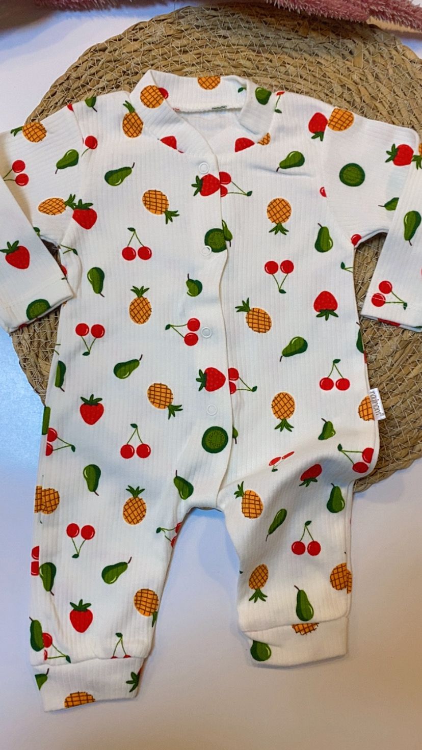 Çilek, ananas, kiraz ve armut gibi rengarenk meyve desenleriyle tasarlanmış bu ribana bebek tulumu, %100 pamuk yapısıyla bebeğinizin cildine maksimum yumuşaklık ve konfor sunar. Nefes alan kumaşı dört mevsim kullanılabilir ve tam boy çıtçıtları sayesinde giydirme–çıkarma işlemi oldukça pratiktir.